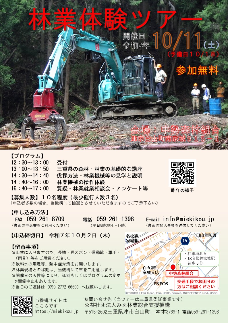 ・開催場所 :中勢森林組合(津市白山町南家城915-1)および林業作業現場