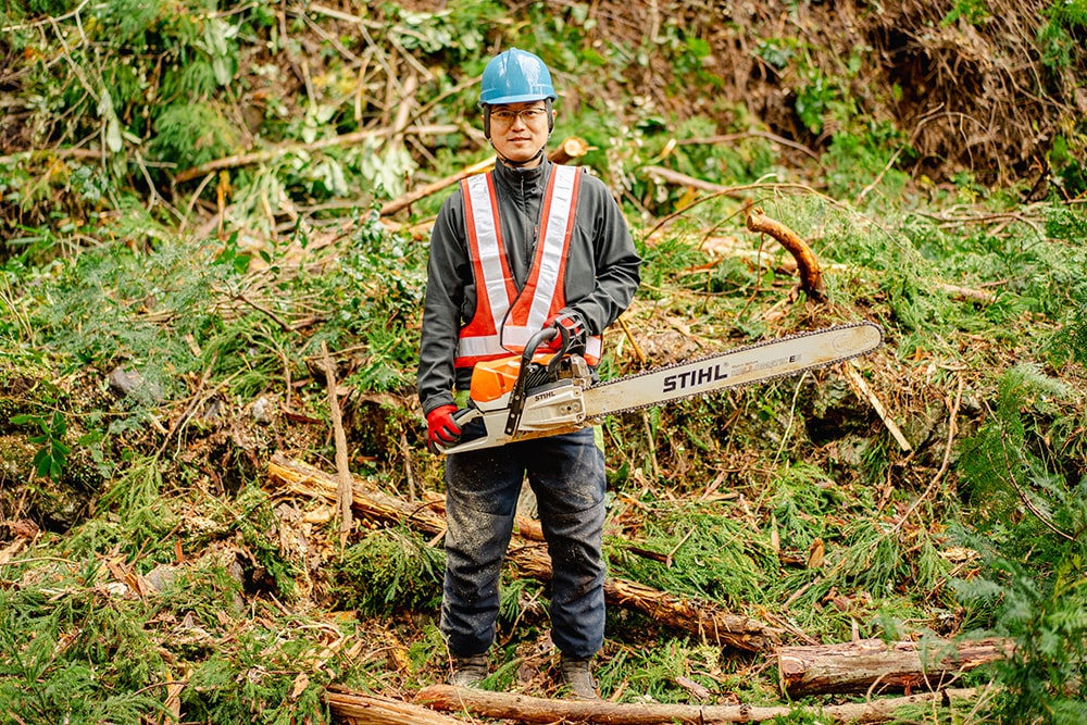 「体形も変わりました。転職した当初は体重が落ちたんですが、また徐々に戻ってきています。でもそれは脂肪ではなく、筋肉によるもの。以前より疲れにくくなりましたし、名実ともに林業従事者の身体に変わってきていることを実感しています」ということです。