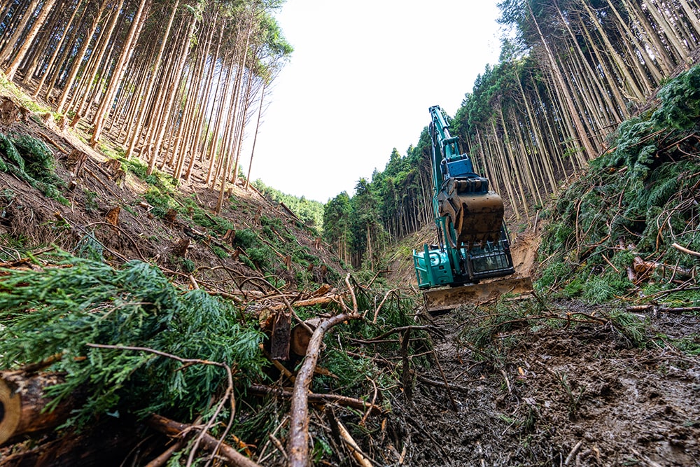 「林業に対するイメージとしてよく言われるのが『自然豊かな環境で、四季の移り変わりや天候の変化などを肌で感じながら健康的に働ける』といったところですよね。でも実際にはチェンソーの音はうるさいし、重機の排気は臭いし、雨の降った次の日は泥まみれになるしで…」。